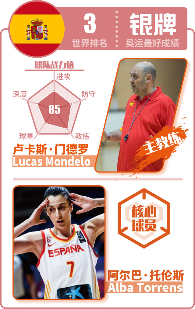 西班牙女篮的后场很有深度,队中有阿尔巴·托伦斯、西尔维娅·多明格斯、克里斯蒂娜·欧维娜、莱娅·帕劳和马塔·萨尔盖等球员,这令人感到不可思议。 如果她们能够登上领奖台,特别是进入到决赛,这将追平奥运历史的最好成绩。